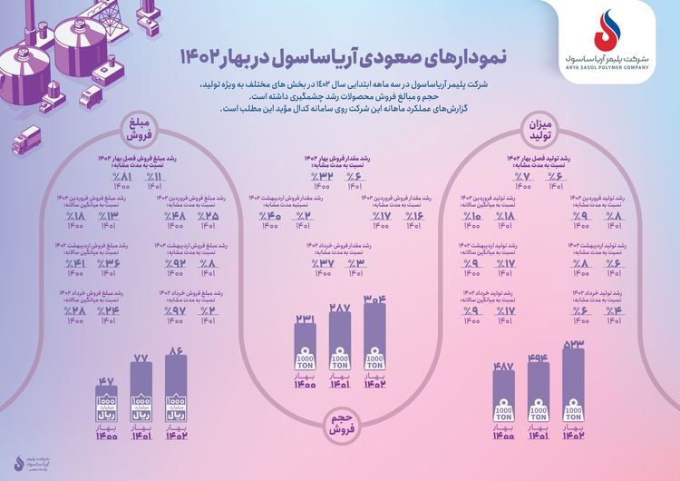 شرکت پلیمر آریاساسول در سه ماهه ابتدایی سال 1402 دربخش های مختلف به ویژه تولید، حجم و مبالغ فروش رشد چشمگیری داشته است.
