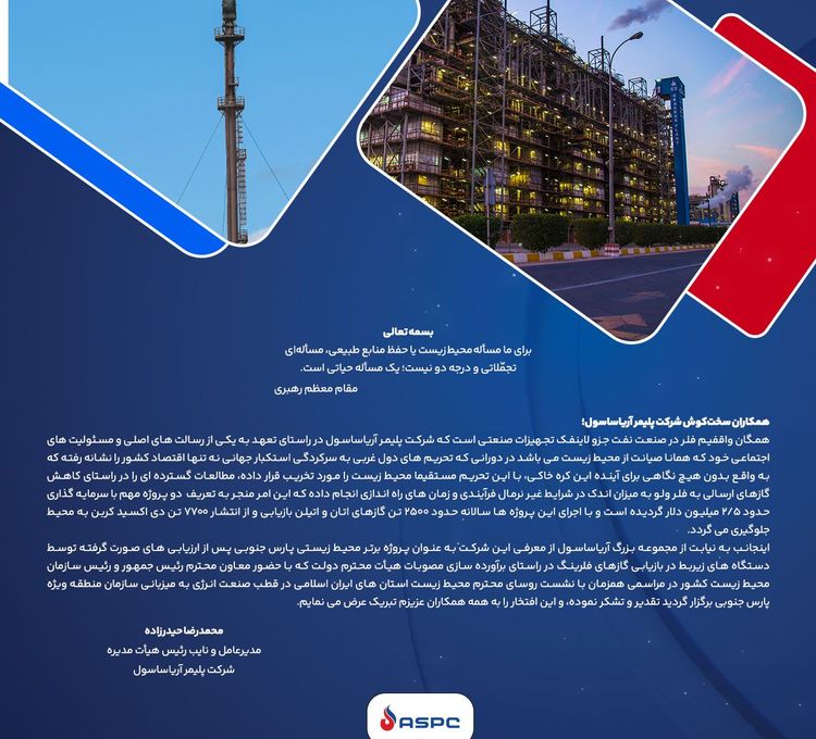 همگان واقفیم فلر در صنعت نفت جزو لاینفک تجهیزات صنعتی است که شرکت پلیمر آریاساسول در راستای تعهد به یکی از رسالت های اصلی و مسئولیت های اجتماعی خود که همانا صیانت از محیط زیست می باشد در دورانی که تحریم های دول غربی به سرکردگی استکبار جهانی نه تنها اقتصاد کشور را نشانه رفته که به واقع بدون هیچ نگاهی برای آینده این کره خاکی، با این تحریم مستقیما محیط زیست را مورد تخریب قرار داده، مطالعات گسترده ای را در راستای کاهش گازهای ارسالی به فلر ولو به میزان اندک در شرایط غیر نرمال فرآیندی و زمان های راه اندازی انجام داده که این امر منجر به تعریف دو پروژه مهم با سرمایه گذاری حدود 5/2 میلیون دلار گردیده است و با اجرای این پروژه ها سالانه حدود 2500 تن گازهای اتان و اتیلن بازیابی و از انتشار 7700 تن دی اکسید کربن به محیط جلوگیری می گردد. اینجانب به نیابت از مجموعه بزرگ آریاساسول از معرفی این شرکت به عنوان پروژه برتر محیط زیستی پارس جنوبی پس از ارزیابی های صورت گرفته توسط دستگاه های زیربط در بازیابی گازهای فلرینگ در راستای برآورده سازی مصوبات هیأت محترم دولت که با حضور معاون محترم رئیس جمهور و رئیس سازمان محیط زیست کشور در مراسمی همزمان با نشست روسای محترم محیط زیست استان های ایران اسلامی در قطب صنعت انرژی به میزبانی سازمان منطقه ویژه پارس جنوبی برگزار گردید تقدیر و تشکر نموده، و این افتخار را به همه همکاران عزیزم تبریک عرض می نمایم.